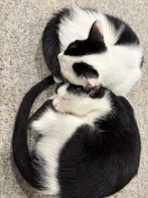 Hot Dog, the boy, is curious, to put it mildly. He gets into everything. He climbs the curtains, jumps onto high places, investigates the insides of cabinets. Nothing seems to be beyond his reach or interest. Beans, the girl, is much more demure. Curious, yes, but circumspect and careful. What they have in common is tremendous warmth and affection, for each other, and for us. They love tummy rubs, throwing themselves down on the floor, rolling on their backs, purring loudly to be cuddled. They are lovely and delightful!