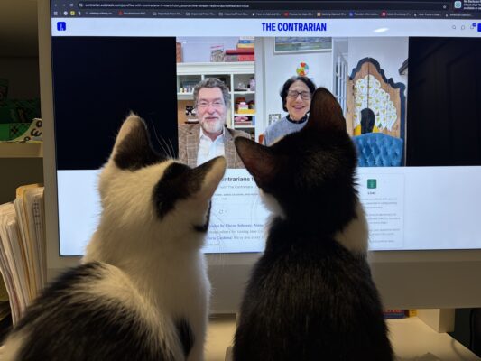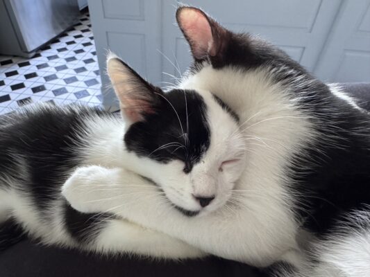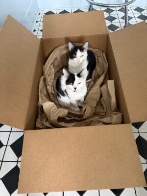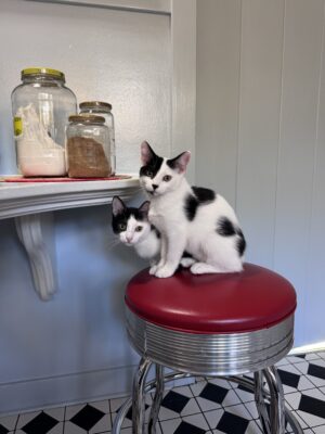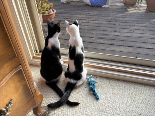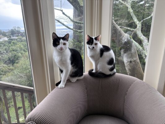 Starting in the fall, the desire for warm fluffy companions arose and on December 6, I adopted three-month-old sibling kittens from the Berkeley Humane Society. Juliet and I immediately fell in love. Meet Hot Dog and Beans!